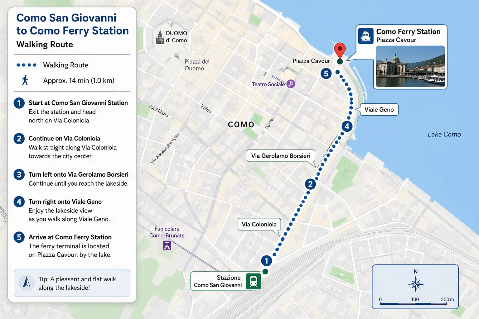 Regional trains from Milano Centrale run to Como Lago in around 40 minutes — and Como Lago station is about 15 minutes walk from the ferry terminal, making it the most convenient option if you want to start your day in Como city. The best station to arrive at is Como San Giovanni, a ten-minute walk from the lakefront (don't arrive at Como Camerlata - this is too far outside of town). Como is a proper city rather than a village, with a cathedral, silk museum and a relaxed lakeside esplanade — worth a few hours in its own right.